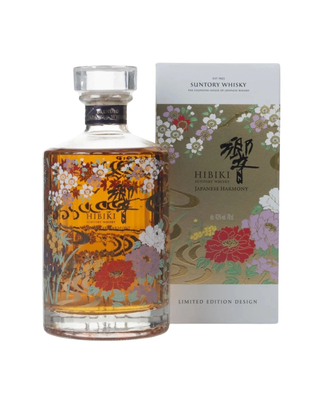 This 2021 limited edition of Hibiki's Japanese Harmony blended whisky features a beautifully designed bottle adorned with artwork depicting blooming flowers and flowing water, celebrating the seasons and the vibrant flora they bring.