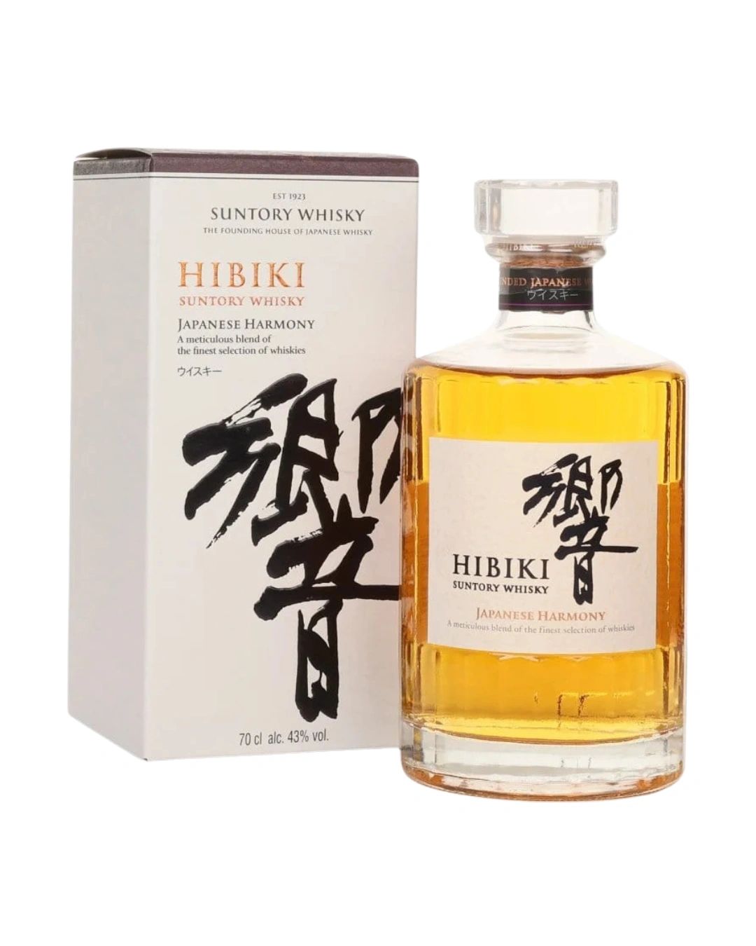 Hibiki Japanese Harmony blends malt whiskies from Yamazaki and Hakushu distilleries with grain whisky from Chita. Aged in five cask types, it presents an elegant profile showcasing honey, orange, herbal notes, and light oak.