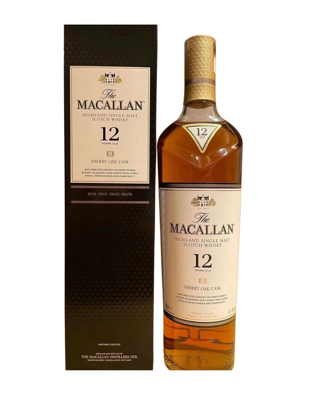 Part of Macallan’s Sherry Oak range, this 12 Year Old has matured exclusively in sherry-seasoned oak casks from Jerez. Bottled at 40% ABV, it embodies characteristic dried fruit and marmalade notes typical of sherried Macallan.